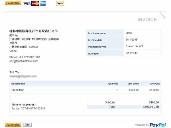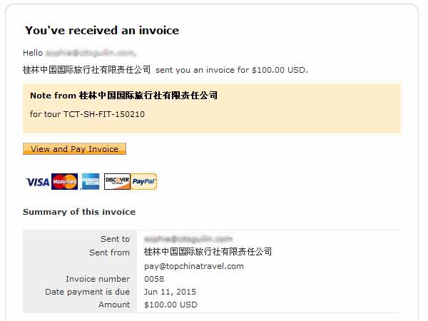 ステップ2: 当社(pay@topchinatravel.com)より、PayPalを通じてお客様のメールアドレス宛に請求書(インボイス)を送信いたします。